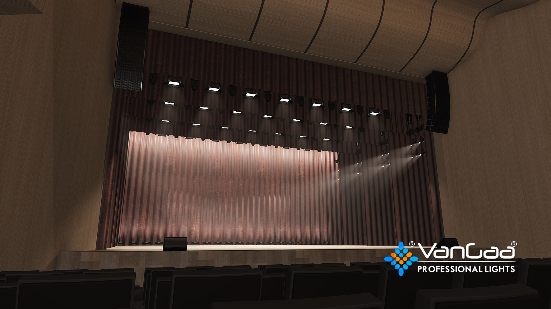상부 행 라이트: 무대 상부에서 아래로投射되는 층위 조명(1~3행)으로, "저부 조명" 기능을 합니다. 관객漏光, 장비 반사 등 잡광 간섭을 제거하면서 전체 무대를 밝혀 끊김 없는 시야를 제공합니다. 소프트 라이트와 LED 컬러 워시 라이트 조합으로 밝은 곳에서 아지랑이까지의 그라데이션(예: 아침 안개, 한밤중 안개)을 구현합니다.